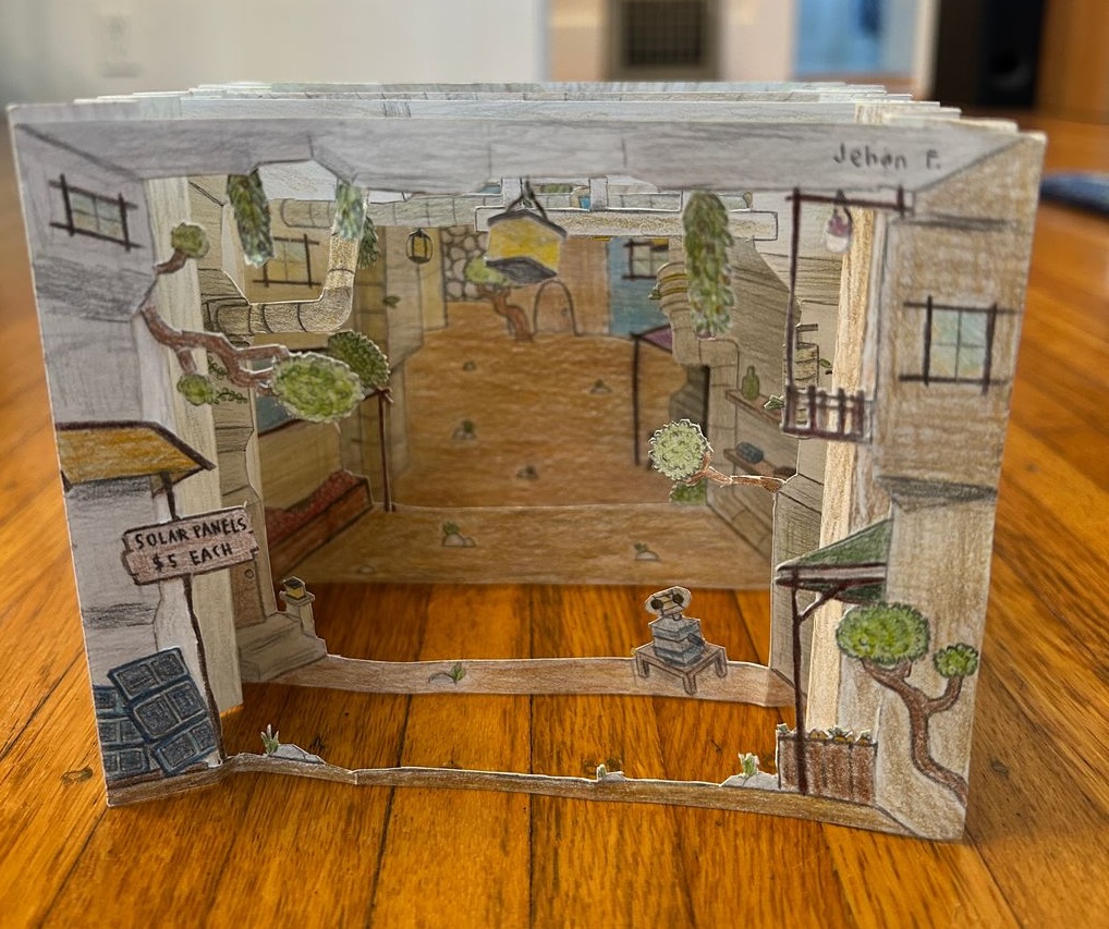 Set in a solar-powered world, this is an accordian-like diorama of an alleyway where items are being sold.