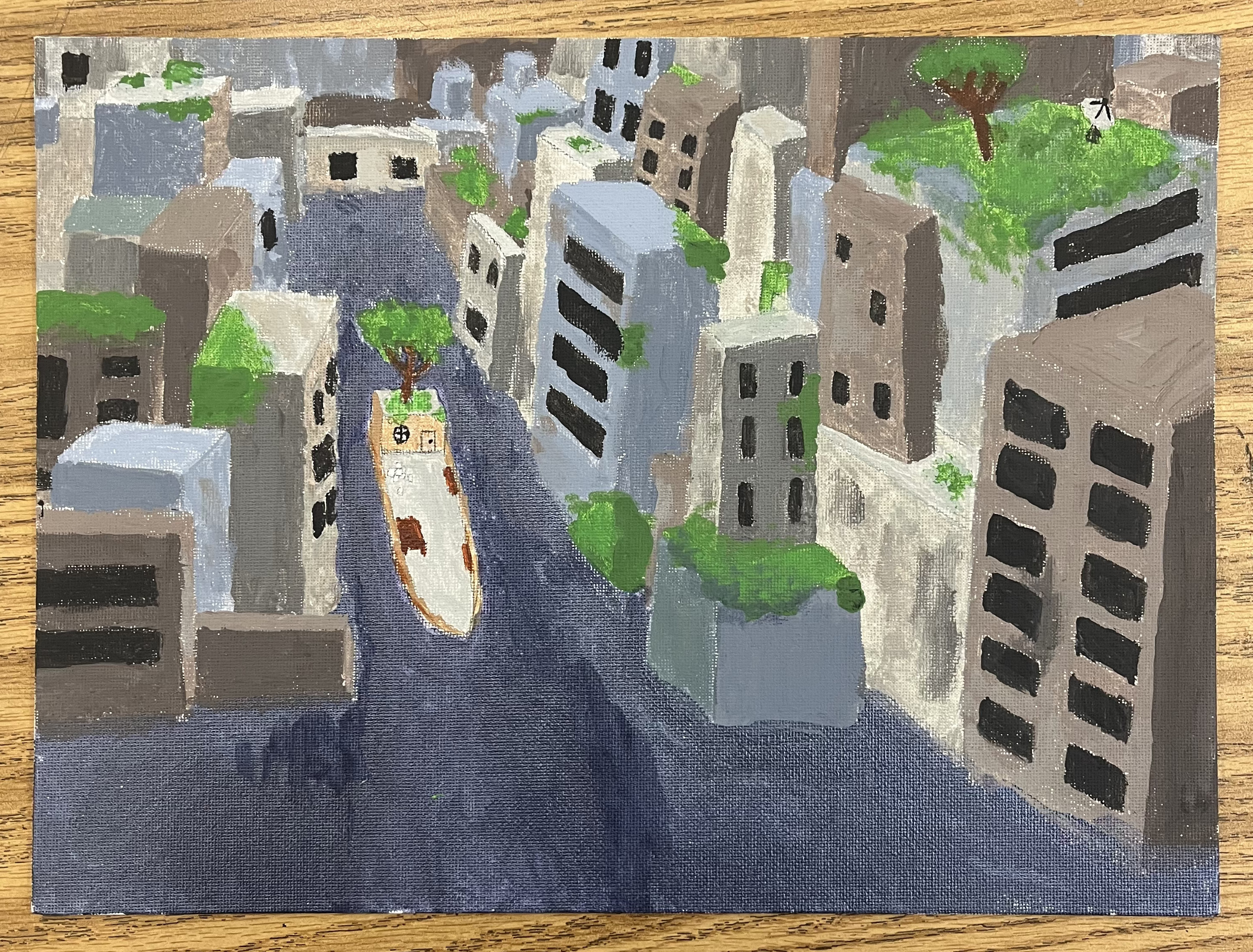 Painted for a school assignment, this is a depiction of New York flooded by rising sea levels five hundred and fifty years in the future.