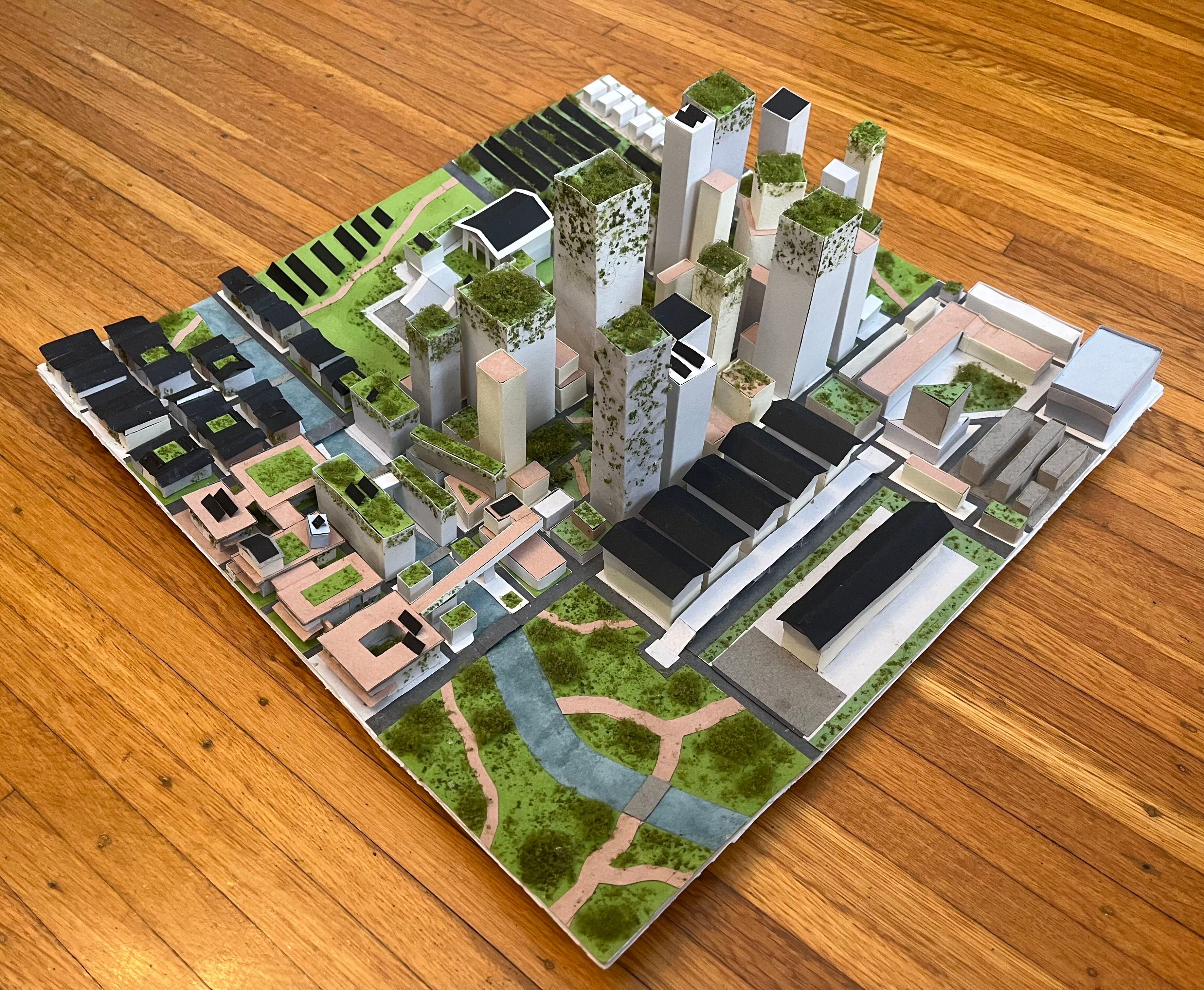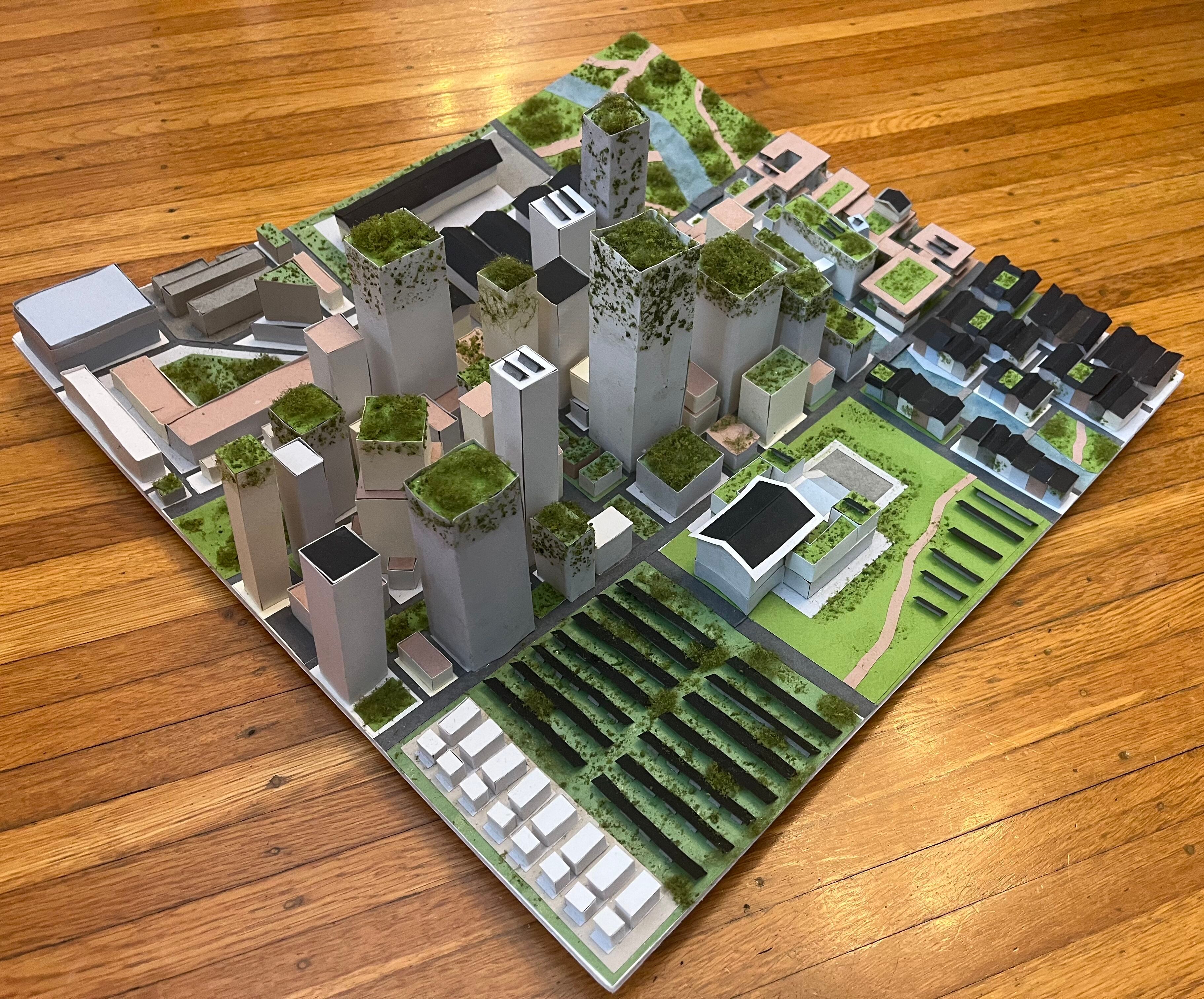 Built by hand over a two-month period for my final project in eighth grade, this is a model of a green, solar-powered city I call Solstice City.